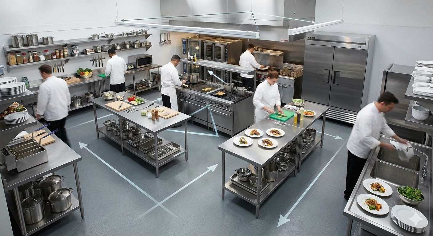 En una cocina industrial, el “triángulo” se expande a un flujo lineal o en zonas, que sigue la lógica del proceso culinario: